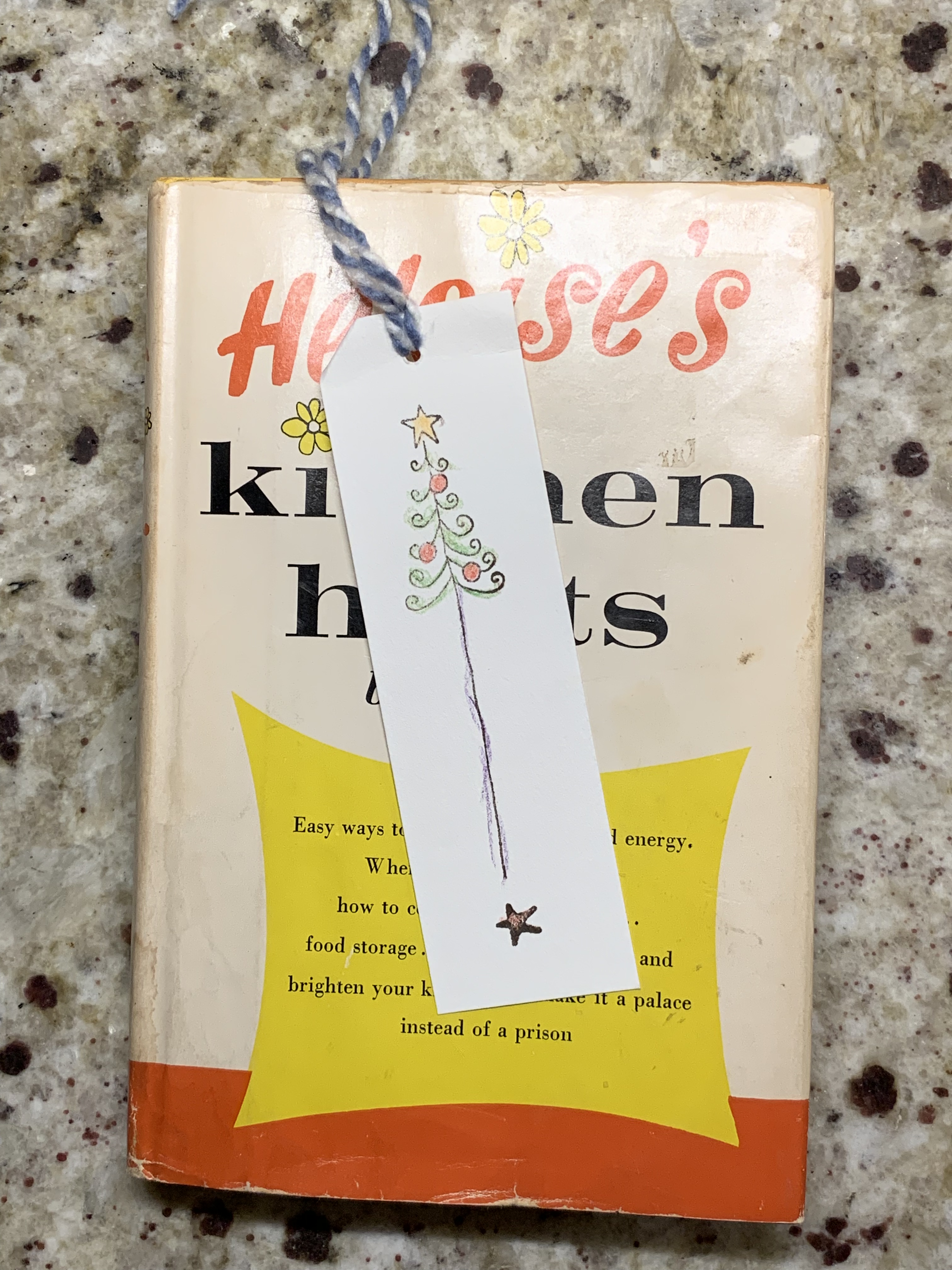 I love that book so much that I was looking for others and found this volume from a seller on Etsy. It’s old, it’s stained, I love it. I asked my husband and kids to get it for me for Christmas since it was right around that time. They’re the best because come Christmas Day, there it was under the tree. I wish I had a picture of the striped tissue it was wrapped in. The seller, shame on me I don’t know their name, put red and white twine around it and everything. It even had a handmade Christmas tree bookmark included.