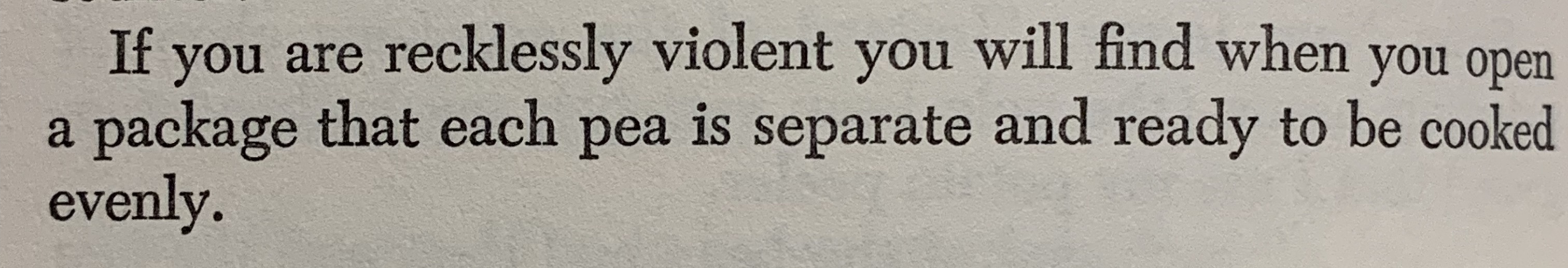 The above sentence stood out to me the first time I read the book. It’s in a chapter about making dinner easier and more efficiently. I love the words “recklessly violent” appearing in a vintage homemaking book.