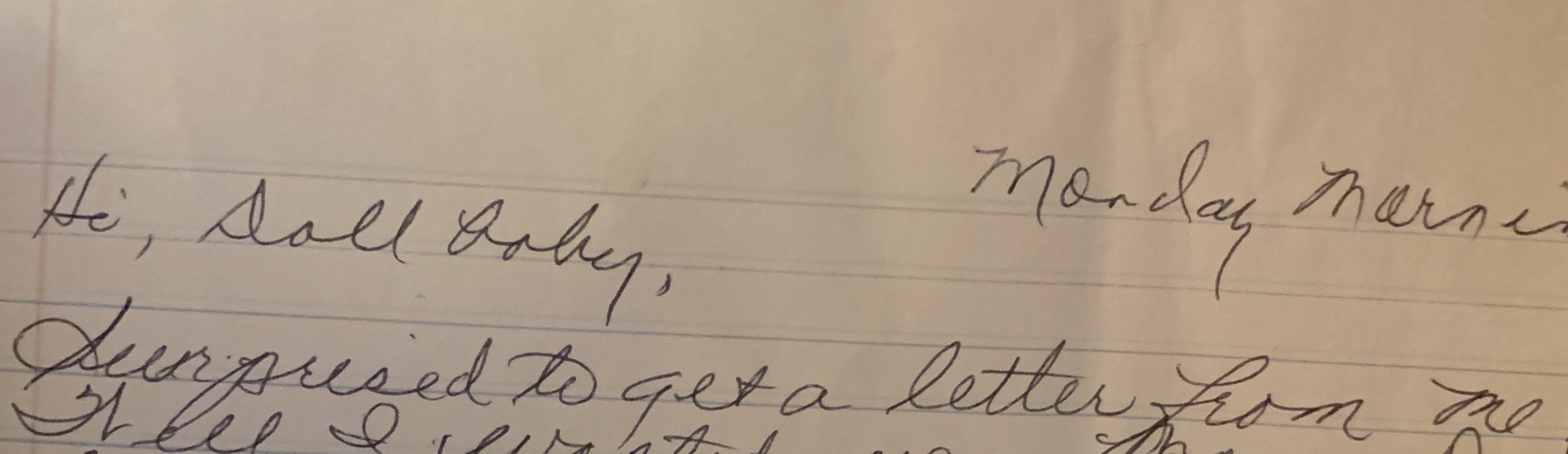 It reads “Hi, Dollbaby, Surprised to get a letter from me?”