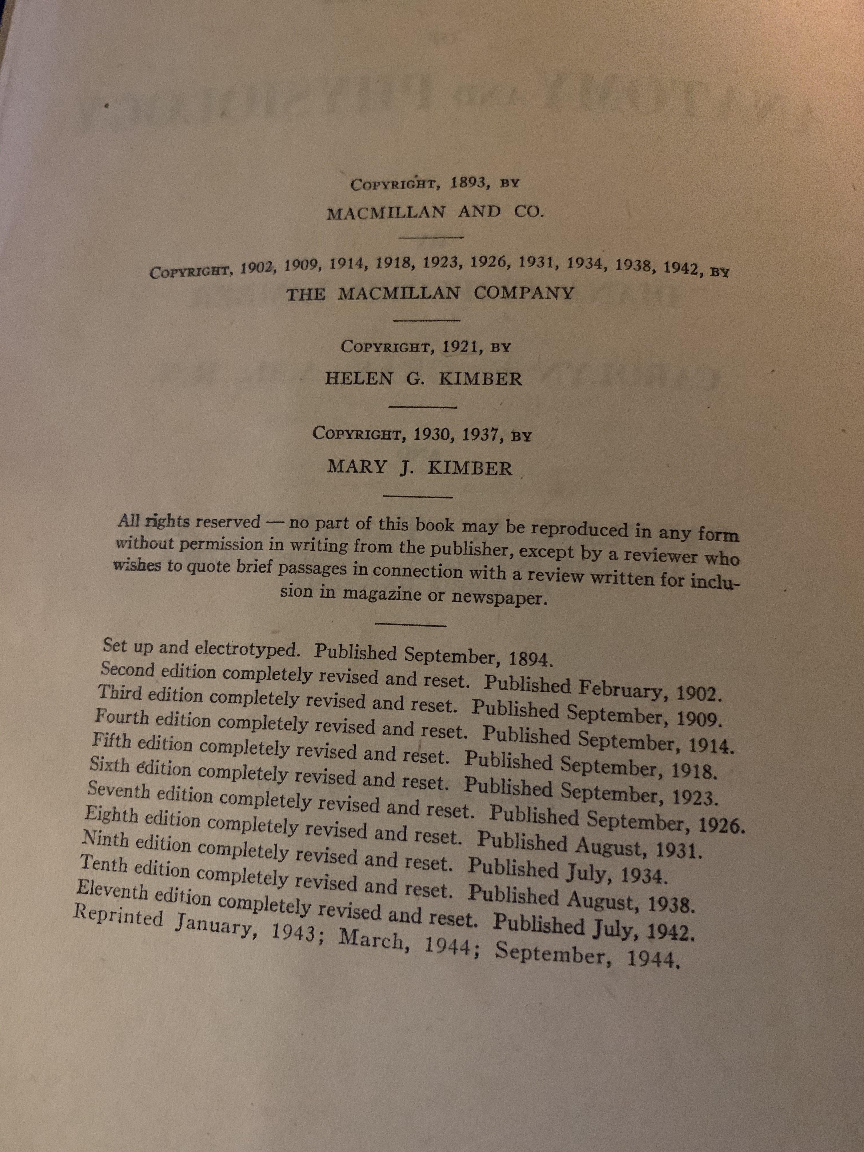 This book, as you can see, was first written in 1893 and updated many times before this edition was published in 1944. I noticed that the copyright does not allow for reproduction in forms other than “magazine or newspaper.”. I hope that the Kimbers or the Macmillan Co don’t mind too terribly much that I have posted it on a blog, the idea of which no one could have imagined when the text was originally copyrighted.